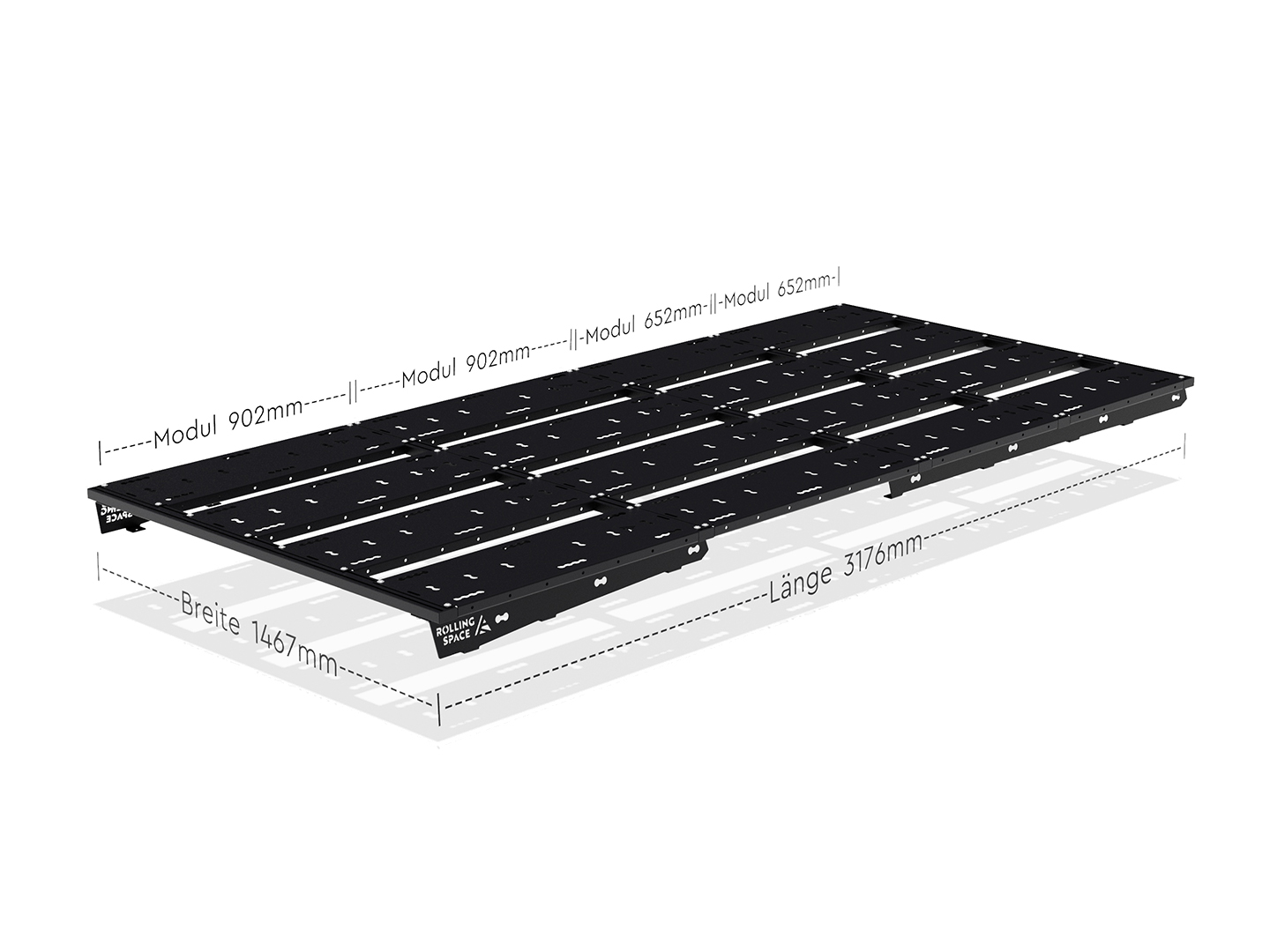 | Ausbaustufe | Basic der günstige Einstieg, bestehend aus Querträgern und den Haltern zur Verbindung mit dem Dach. Kann jederzeit auf Standard und Extended erweitert werden. | Standard superleicht und dennoch bequem begehbar. Das SpaceRack das alles kann. | Extended für alle die mehr wollen, das SpaceRack Extended bildet eine komplett geschlossene Plattform und ist somit Ideal als Dachterrasse nutzbar. |