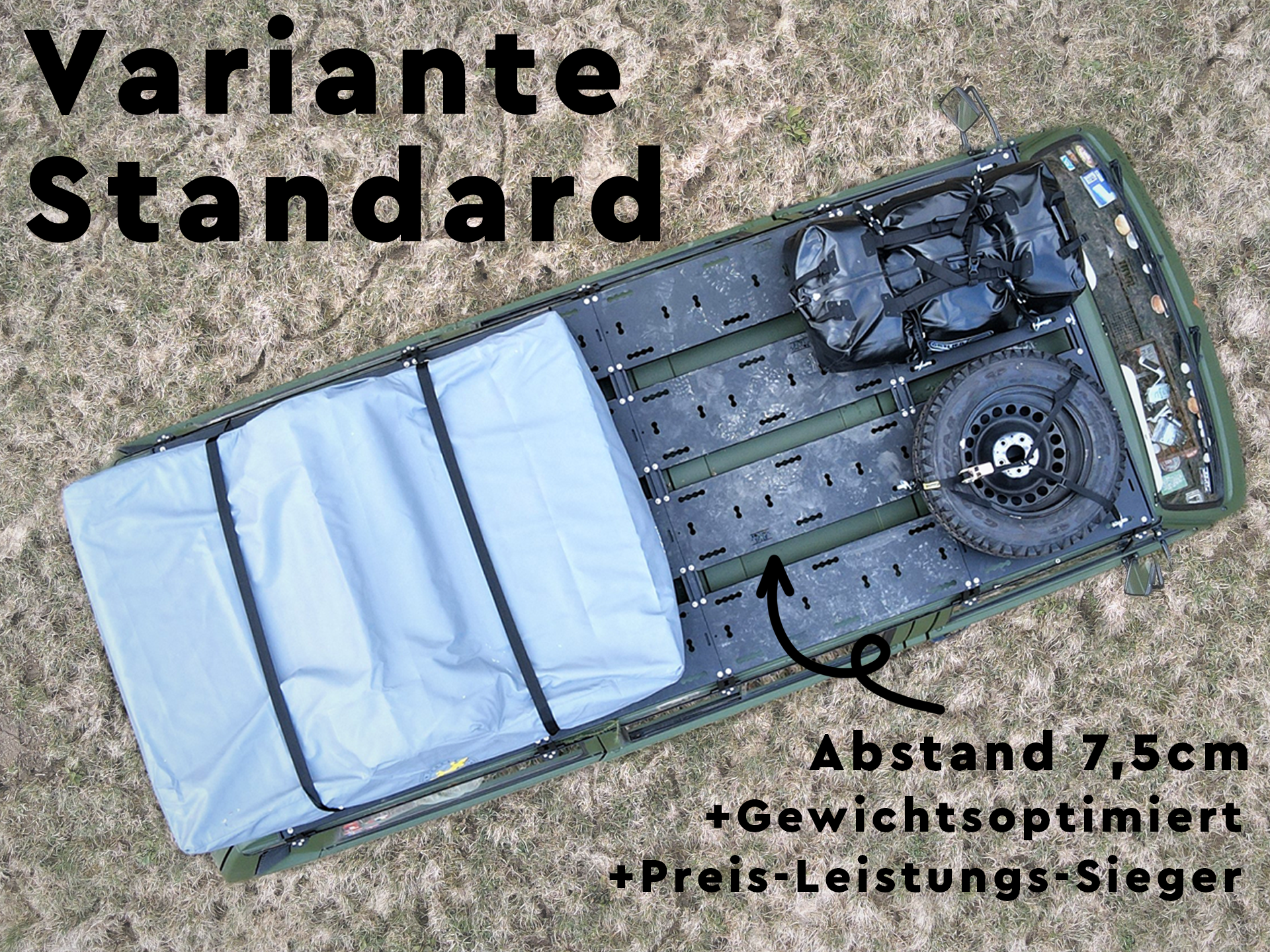 Fahrzeugspezifische Halterung sowie alle Schrauben und Nutensteine aus Edelstahl. Querträger sowie Modulplatten aus hochfestem Aluminium.