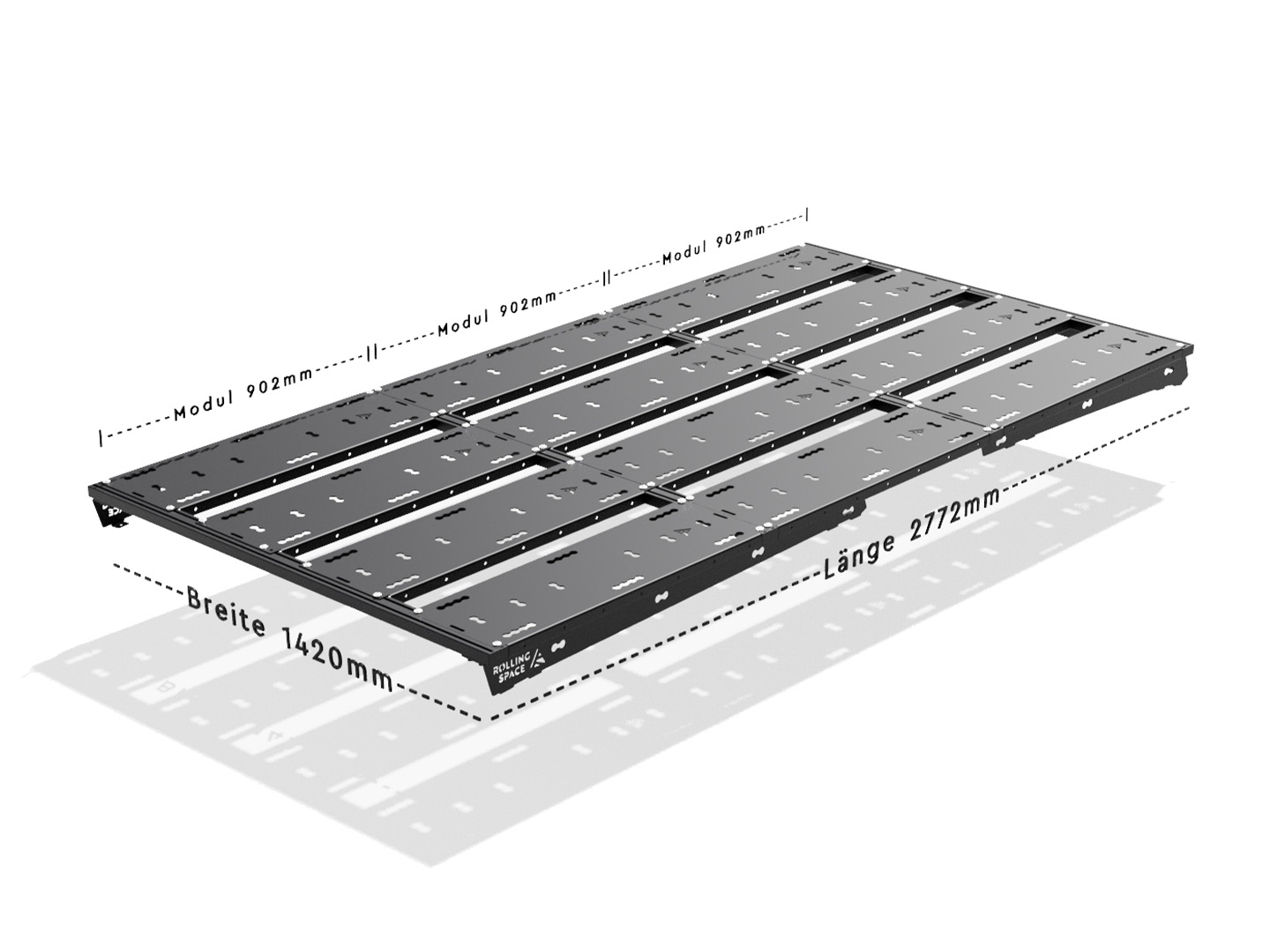 ohne ModuleBasic:der günstige Einstieg, bestehend aus Querträgern und den Haltern zur Verbindung mit dem Dach.Kann jederzeit auf Standard erweitert werden. Schreib uns dazu einfach an. | Module + SpaltenStandard:superleicht und dennoch bequem begehbar. Das SpaceRack das alles kann. | komplett mit Modulen belegtExtended:für alle die mehr wollen, das SpaceRack Extended bildet eine komplett geschlossene Plattform. |