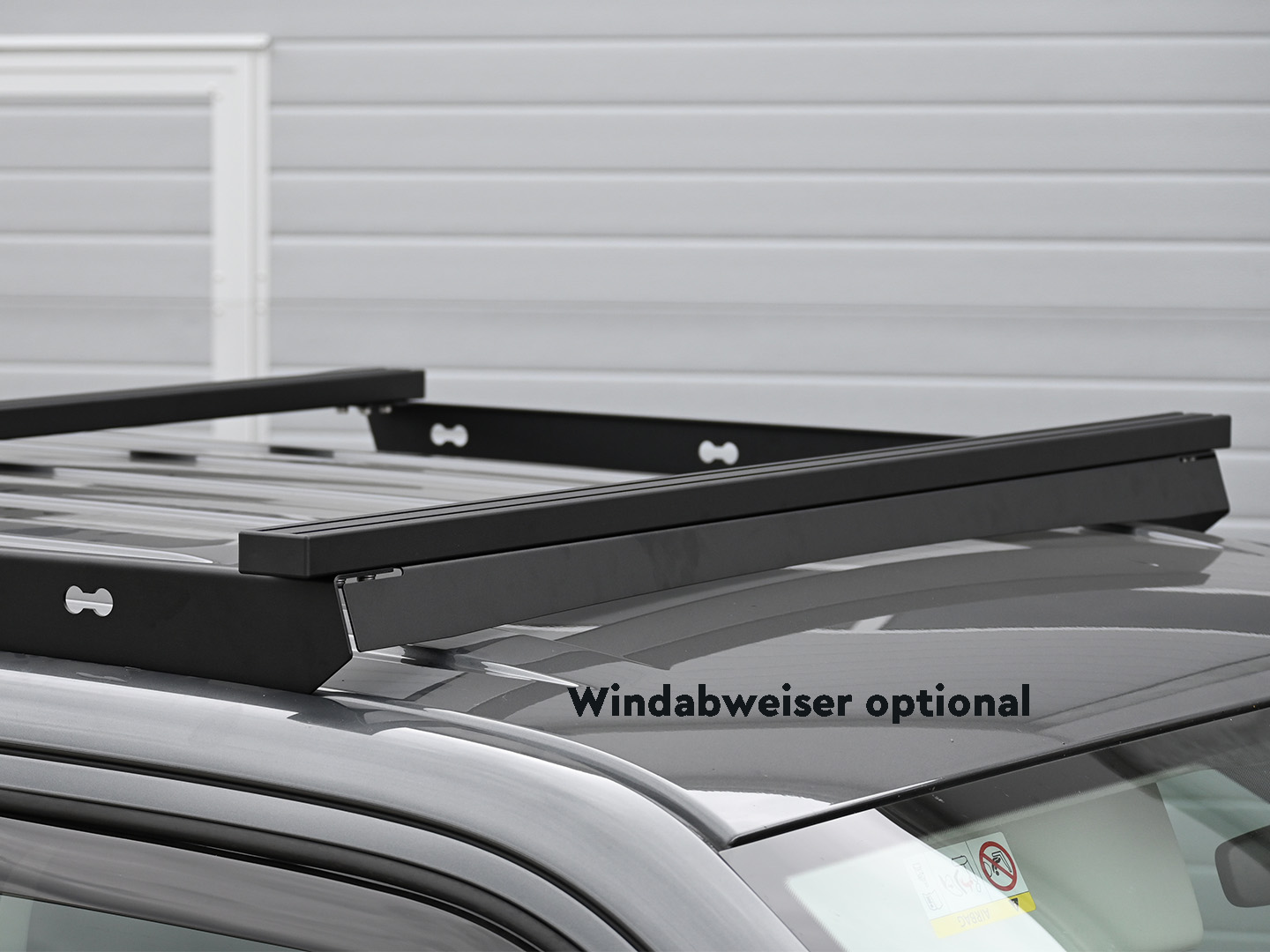 Die flache Bauweise von nur 50mm Aufbauhöhe minimiert Windgeräusche und Treibstoffverbrauch. Ein optional erhältlicher Windabweiser verbessert die Aerodynamik weiter. Auch bleibt die Fahrzeughöhe unter 2m, das ermöglicht dir weiterhin Tiefgaragen zu befahren.