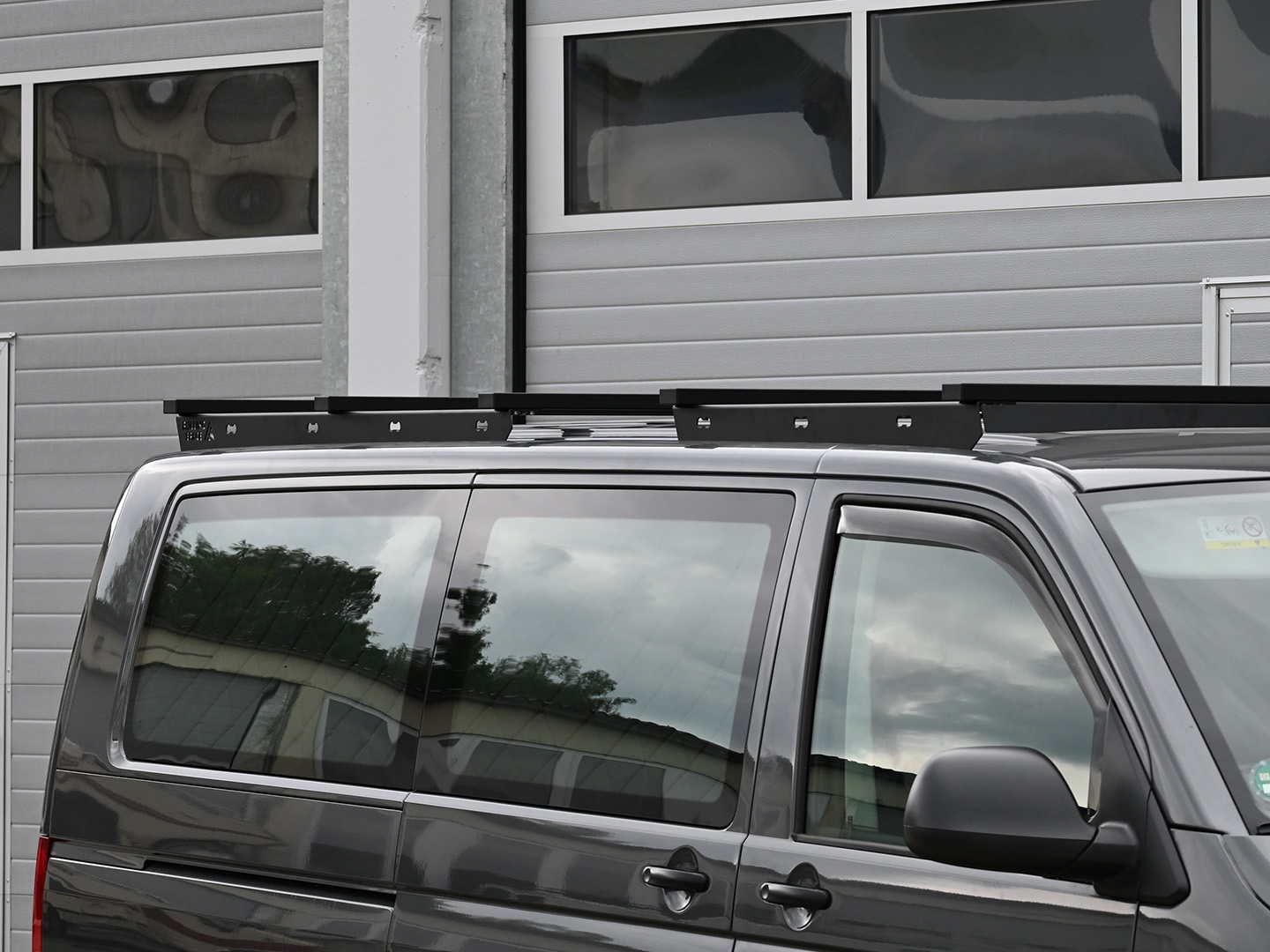 Das Dachträgersystem ist mit allen Ausstattungsvarianten des VW T6 wie Multivan, Caravelle und Transporter kompatibel, ausgenommen sind die Modelle California Beach & Ocean und Hochdach Fahrzeuge.