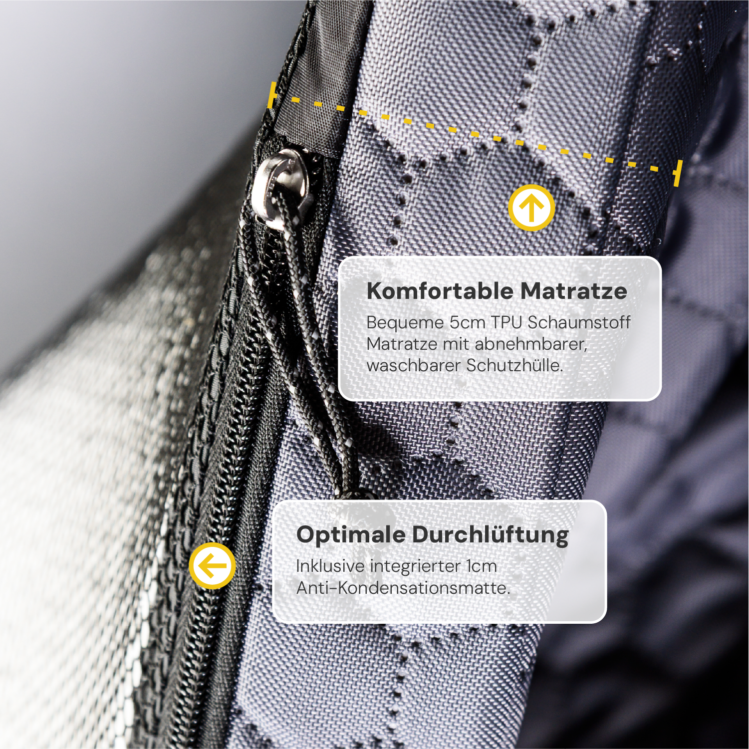 - Gewicht: ca. 89 kg (Zelt inkl. Matratze)