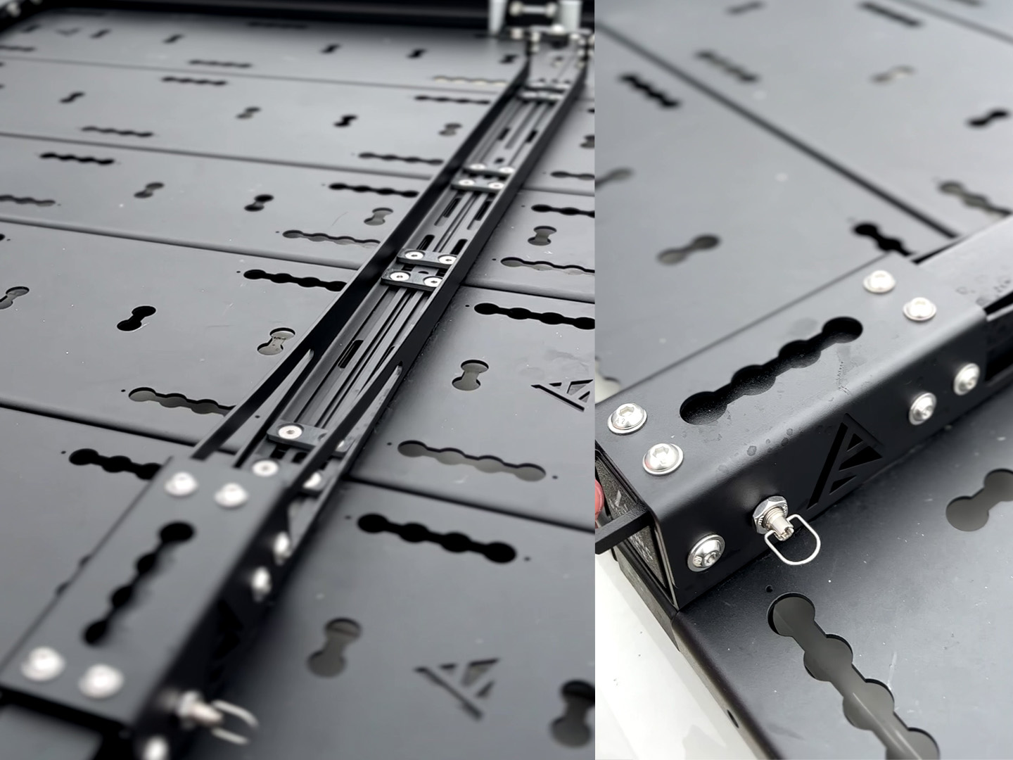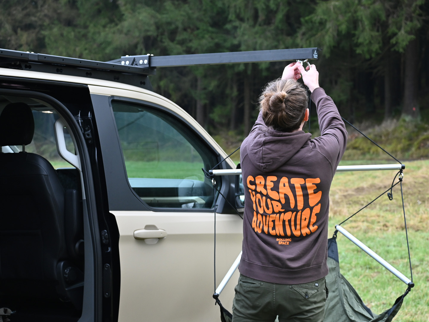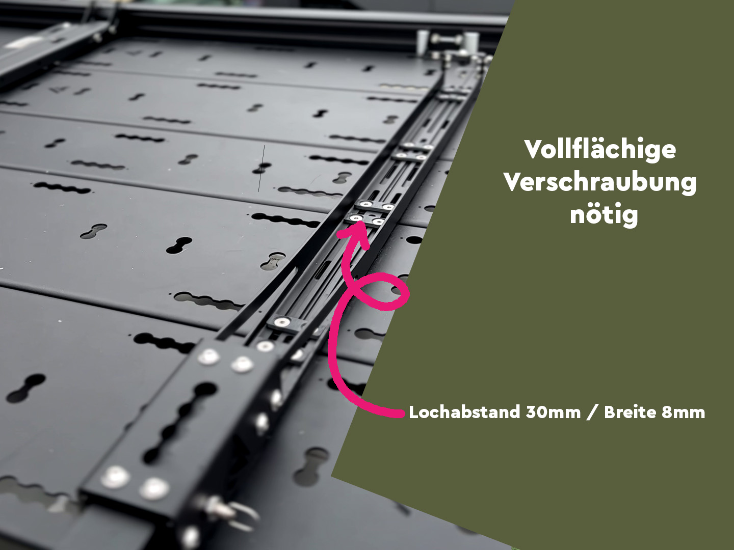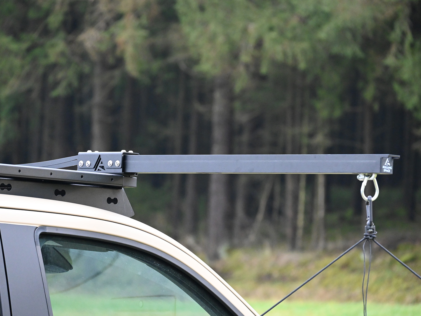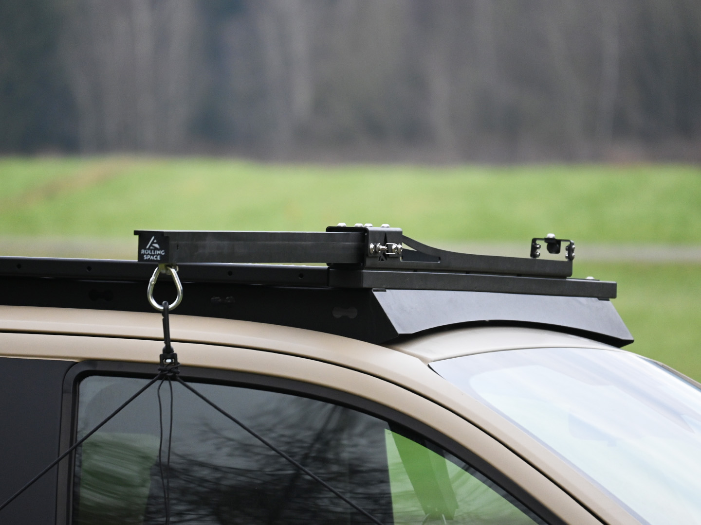 - Universal an Unterkonstruktion (verschiedenste Trägerarten/Eigenbaulösungen): SpaceHook OHNE Befestigunsmaterial mit Sicherungsgurt - HINWEIS: Stabilität dieser Träger müssen berücksichtigt werden! Es müssen M8 Schrauben zur Montage am Fahrzeug verwendet werden.