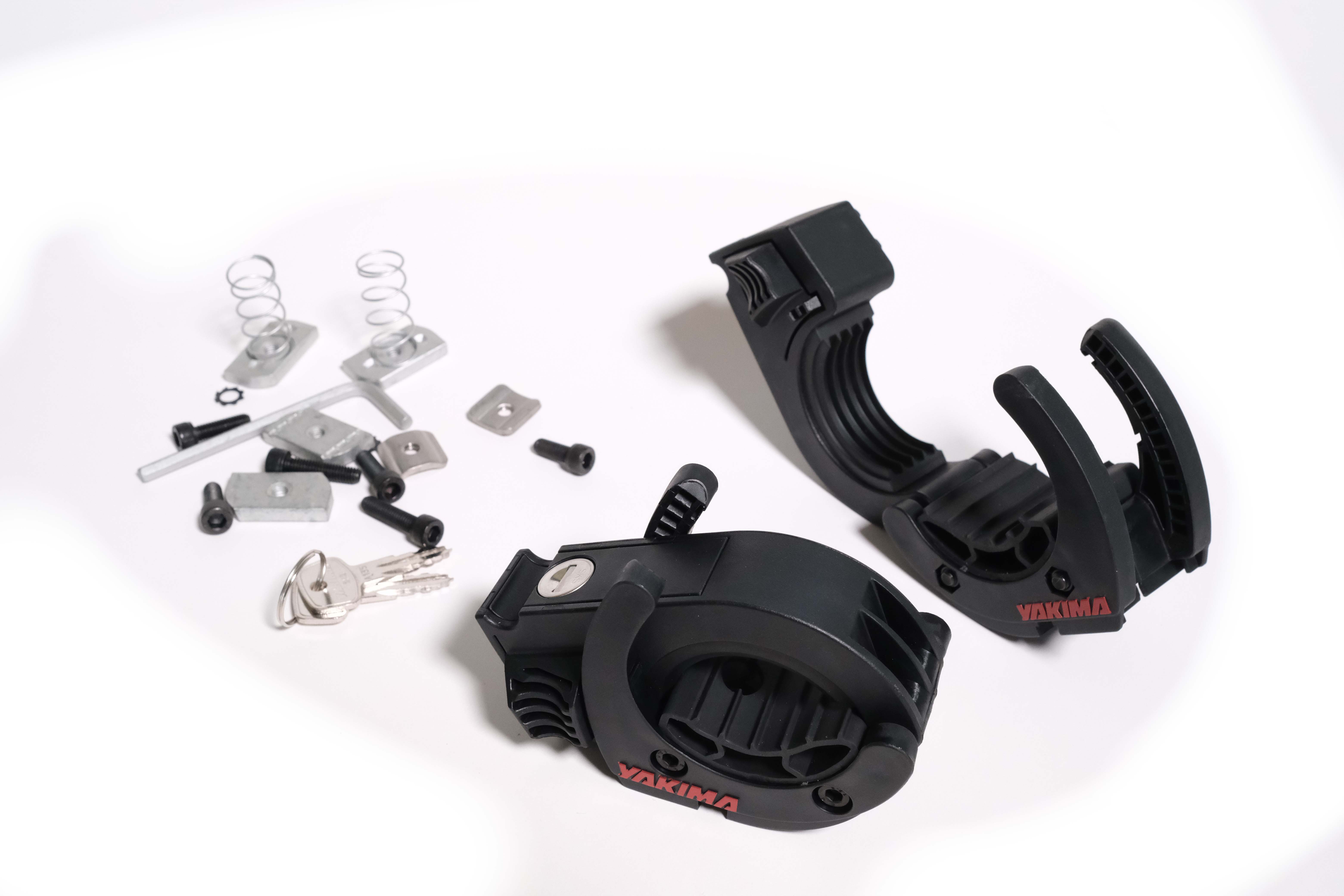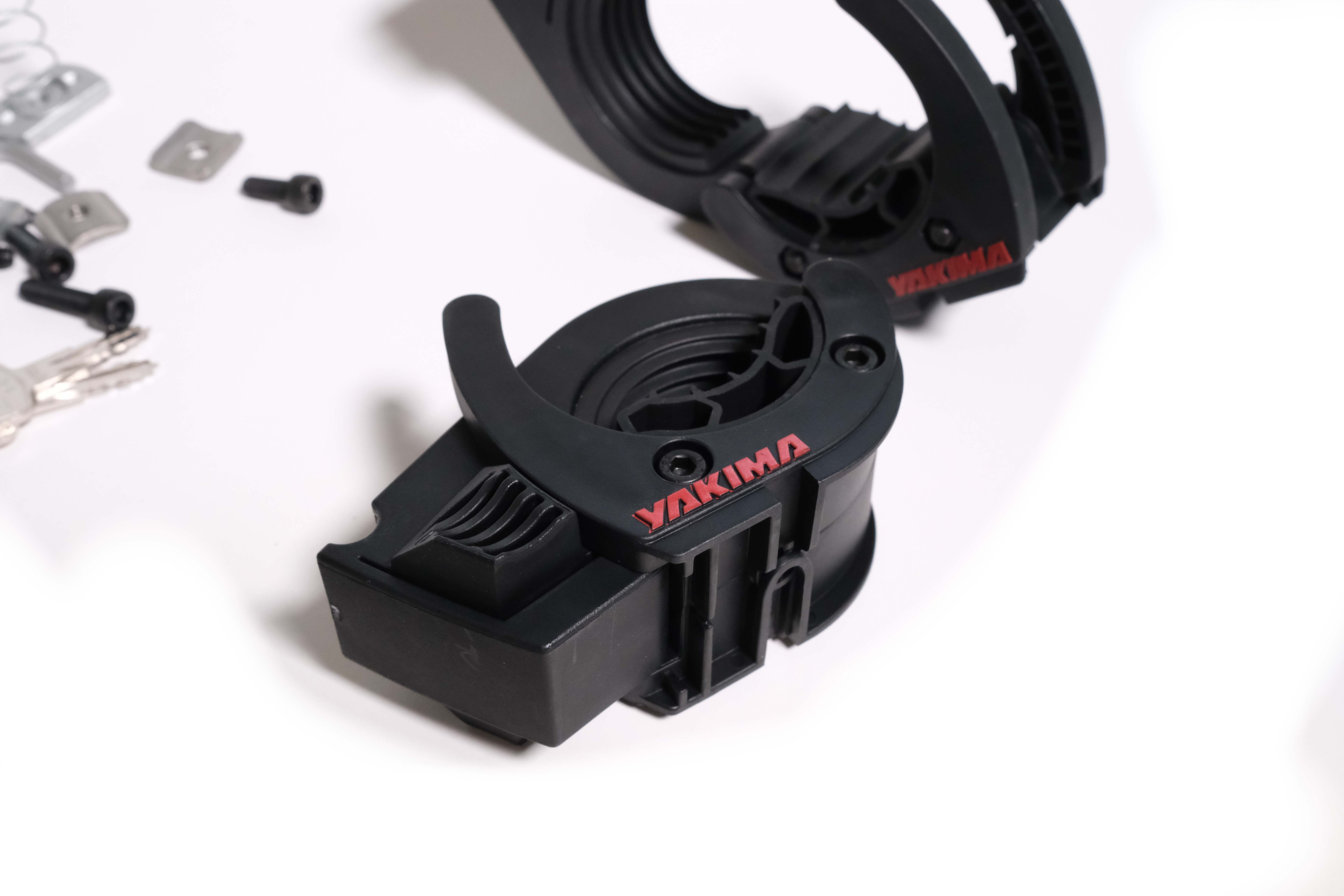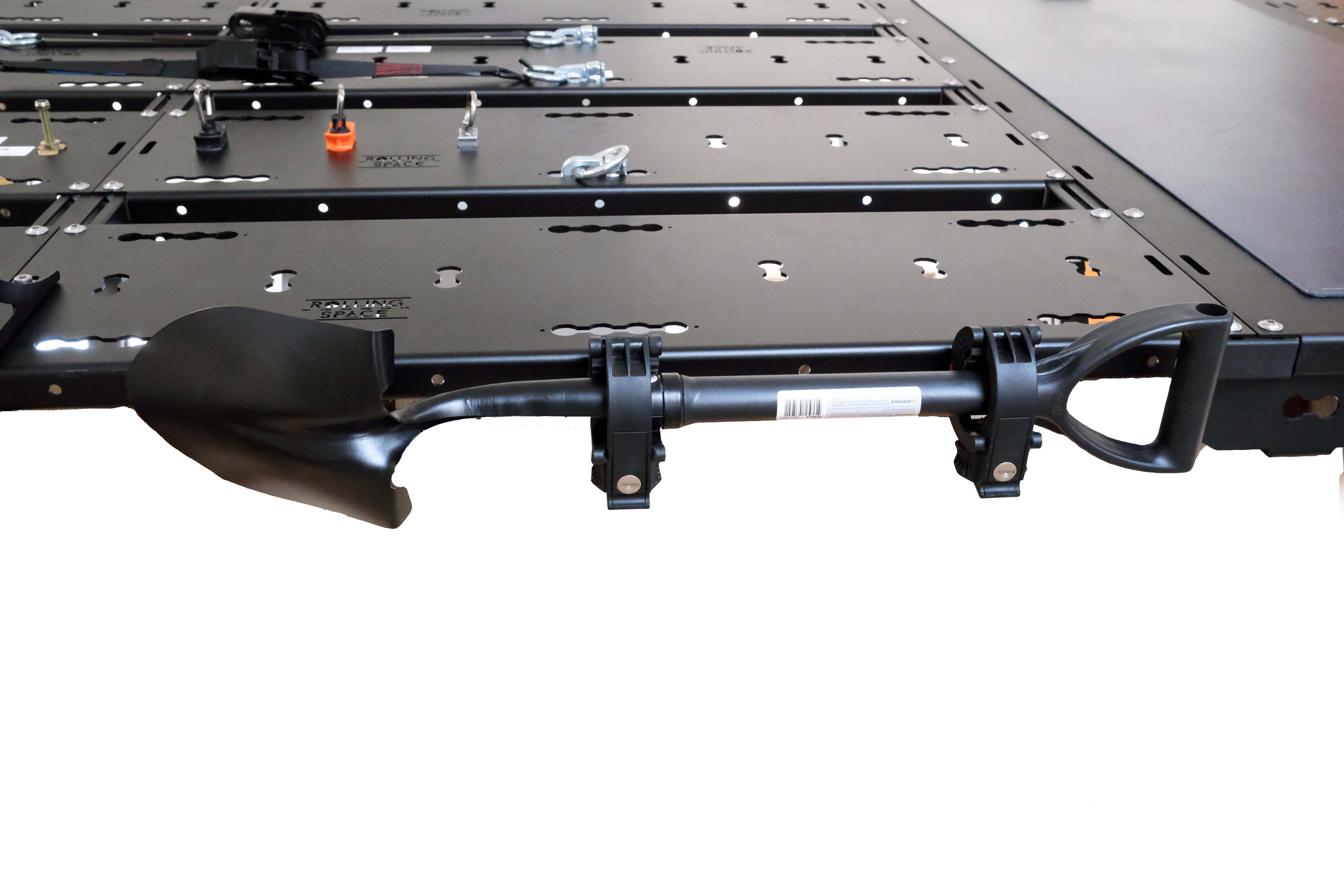 Mit den absperrbaren Gerätehaltern befestigst du Schaufeln, Paddel oder Äxte seitlich am SpaceRack Dachträger.